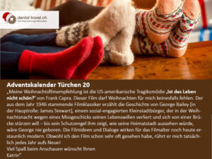 Hinter dem 20. Türchen des Dental Travel Adventskalenders steckt eine tolle Filmidee für die Weihnachtszeit von unserer Kollegin Katrin. Sie ist bei uns schon viele Jahre im Expertenteam tätig und Ansprechpartnerin für alle Fragen rund um Ihre kostengünstige Zahnbehandlung in Ungarn. Sehr gern berät sie Sie mit ihrem Expertenwissen.