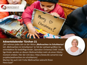 Nur noch drei Tage bis Heiligabend! Hinter diesem Türchen unseres Dental Travel Adventskalenders verbirgt sich eine Weihnachtsaktion von unserer Kollegin aus dem Expertenteam: Petra Gastl. Das Expertenteam beantwortet alle Fragen rund um Ihre kostengünstige Zahnbehandlung in Ungarn, stimmt die Termine mit unseren Partnern in Ungarn ab und organisiert auf Wunsch sogar Ihre komplette Reise! Dieser Service ist für Sie kostenlos!